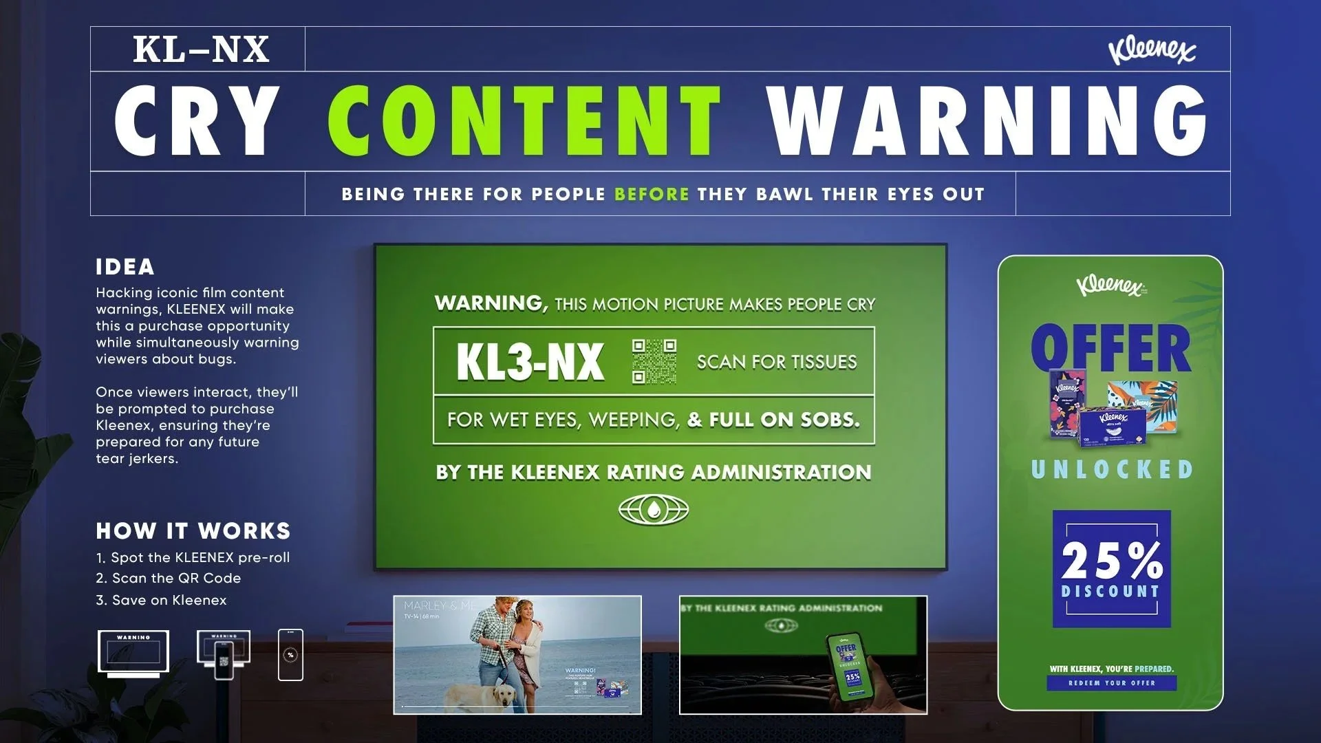 …until now! Kleenex understands the value of knowing when you’ll need them, so we’re showing up when you want us most! My copy partner and I had such a fun time riffing on how that could happen, and we started with Kleenex: Cry Content Warnings